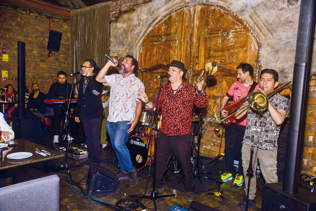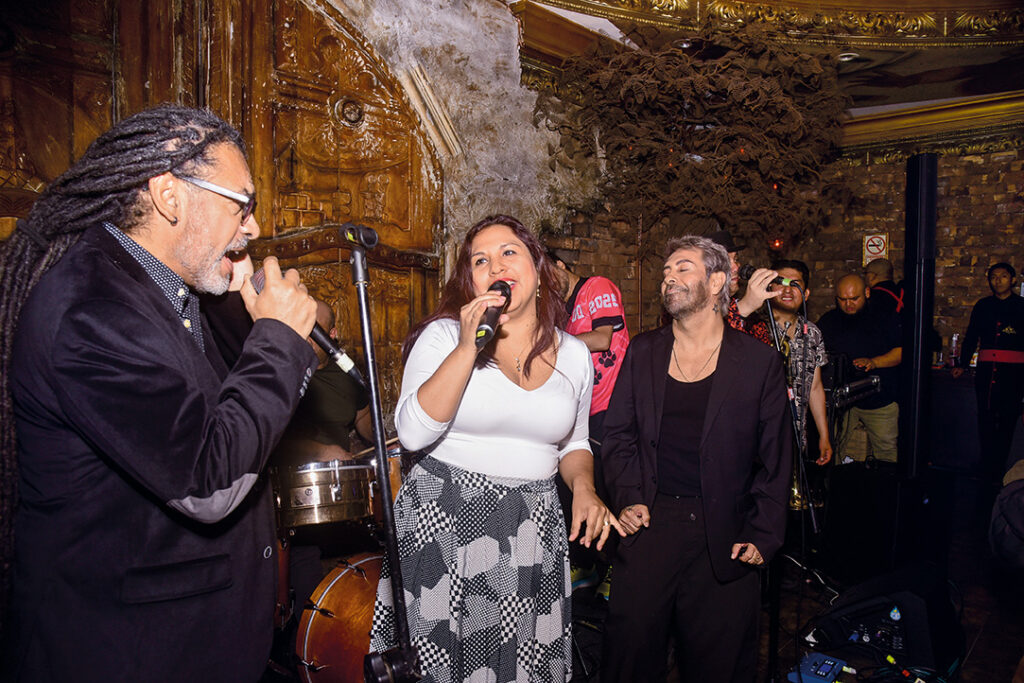 Claudia Manrique cantando con los Fabulosos Primos en la noche de aniversario de la revista.