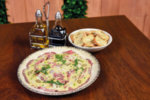 en salsa de atún con arúgula, parmigiano y alcaparras.